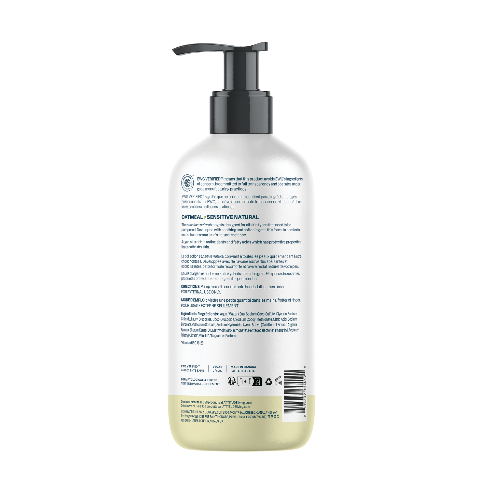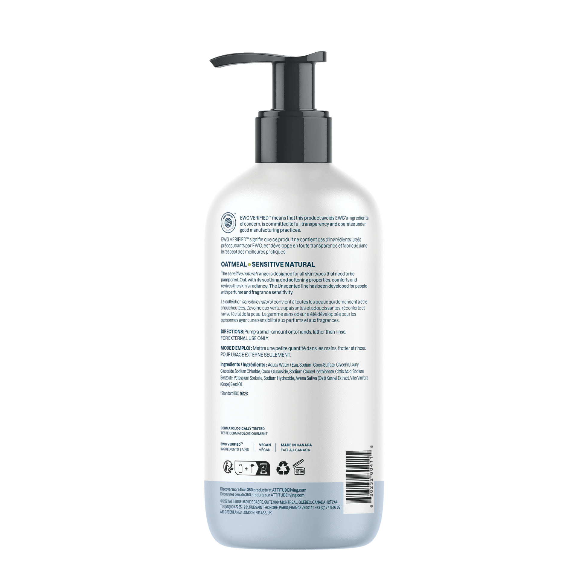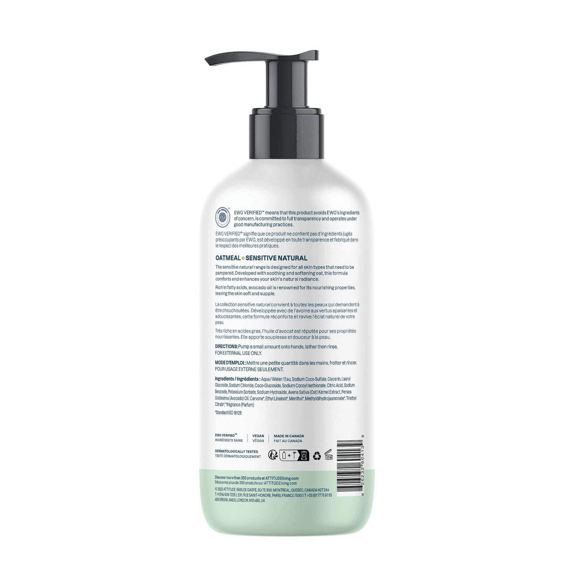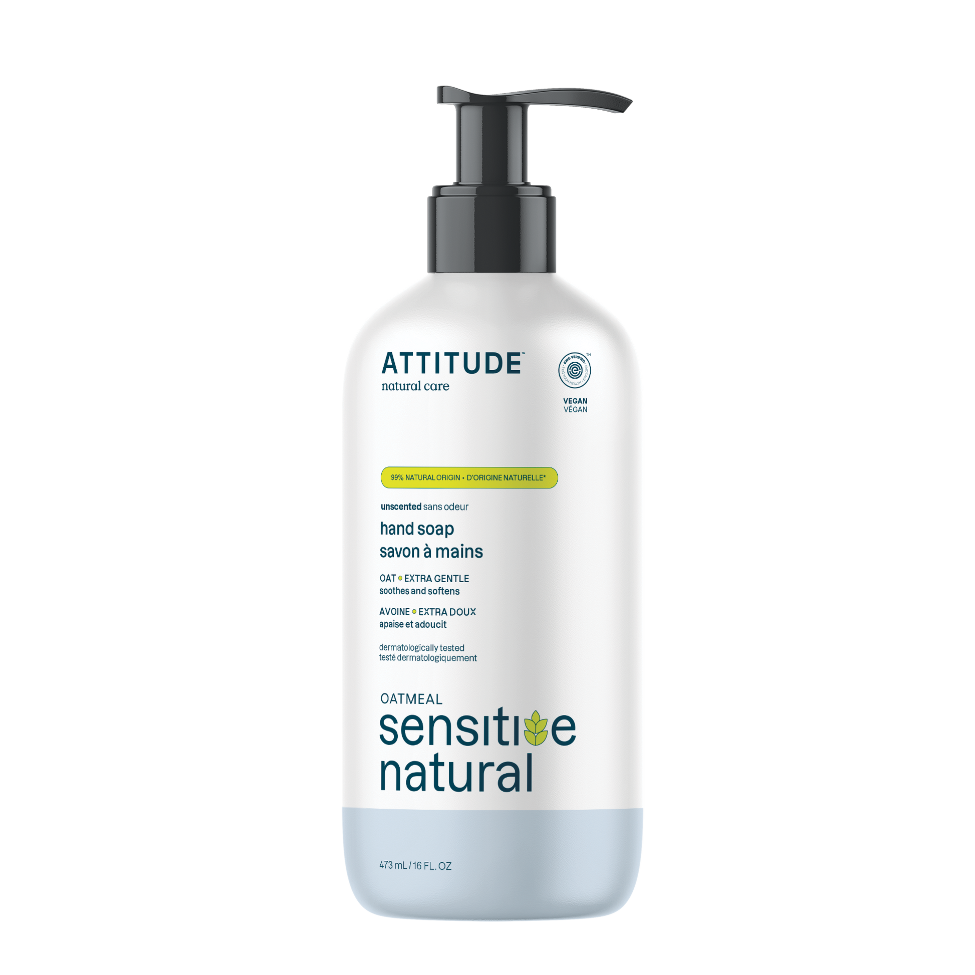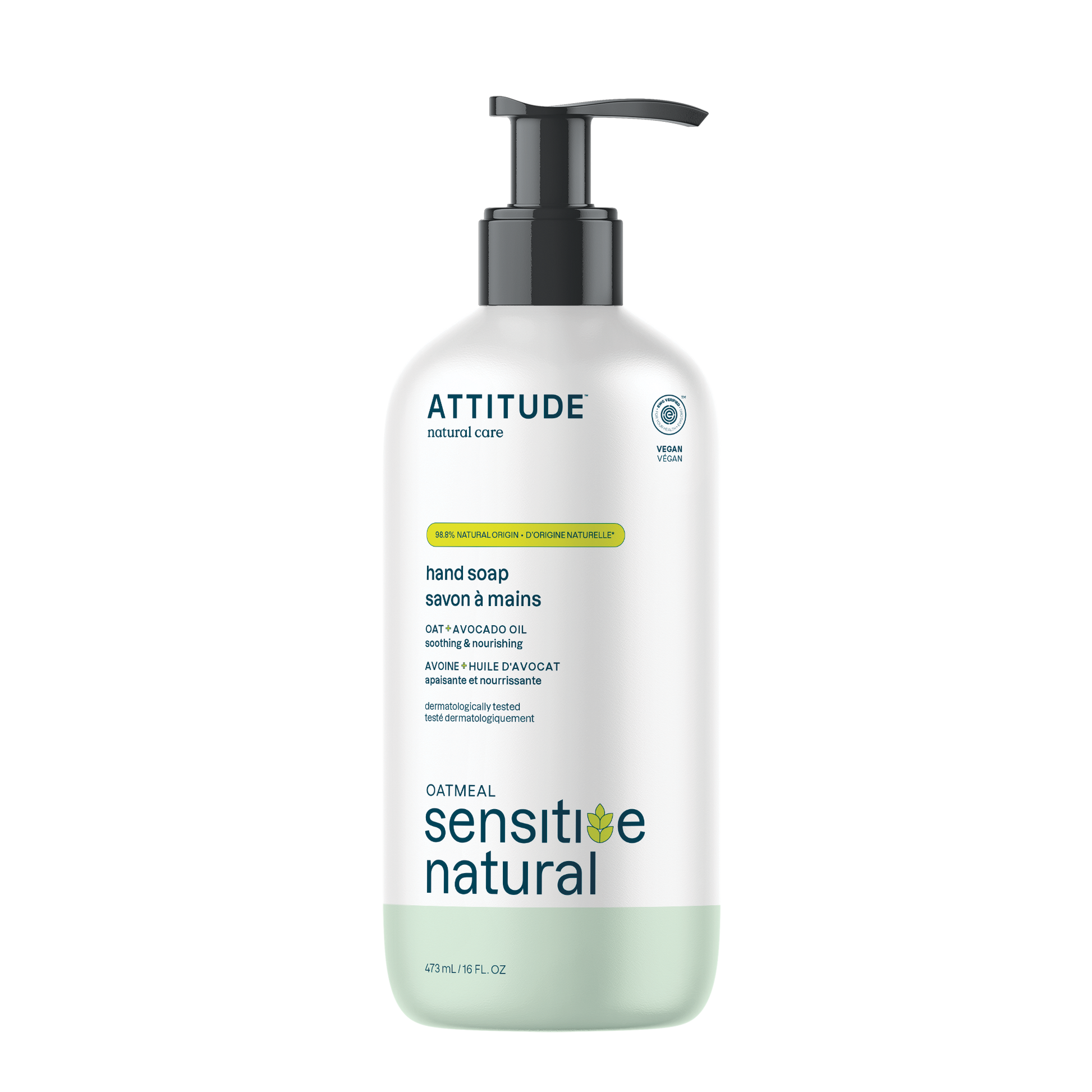 ATTITUDE's Sensitive Skin Natural Hand Soap, bears the EWG VERIFIED™ seal, has been dermatologically tested. Our plant- and mineral-based vegan formula is extra gentle and ideal for deep and gentle cleansing of delicate skin, while leaving hands clean and hydrated. Plus, it's infused with oat extracts to stimulate your senses and soothe your sensitive skin, making it perfect for frequent use.